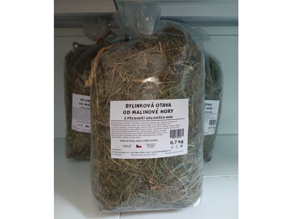 Bylinková otava pochází z luk čisté a nedotčené přírody. Tato oblast je protkána linií předválečného opevnění a dnes zde doslova lišky a vlci dávají dobrou noc. Louky jsou sečené s maximální péčí, otava je díky tomu velmi žratelná a krásně zelená. Obsahuje mnoho nejrůznějších bylin a travin, což domácí mazlíčci zajisté ocení. Tato otava je vhodná především pro zakrslé králíky, křečky, morčata, sysly, psouny, želvy a jiné domácí mazlíčky baštící seno a otavy. Bylinkové seno od Malinové hory Vám vřele doporučuje i místní lidmi oblíbený skřítek od Zlaté skály.