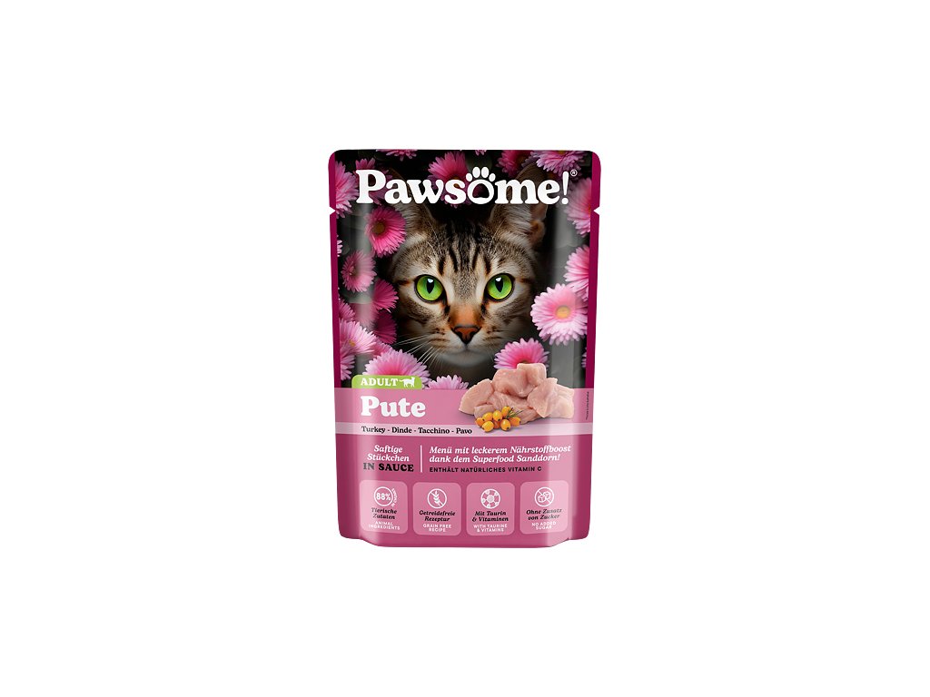 Šťavnaté kousky s krůtím masem, lněným olejem a rakytníkem v lahodné omáčce jsou kompletním krmivem s vyváženým podílem bílkovin, tuků, vitamínů a minerálů, které přispívají ke spokojenému a aktivnímu životu dospělých koček všech plemen a velikostí. Krmivo Pawsome! je vytvořeno tak, aby splňovalo očekávání i těch nejmlsnějších mazlíčků a zároveň zajišťovalo jejich zdraví, vitalitu a celkovou spokojenost. Jeho delikátní chuť, vůně a kombinace kousků masa a omáčky nabízí kočkám jedinečný chuťový zážitek a zároveň jim dodává živiny nezbytné pro jejich každodenní dobrodružství. Kočky jsou masožravci, a proto krmivo Pawsome! obsahuje velké množství živočišných bílkovin a nenajdete v něm obiloviny ani přidaný cukr – protože ani jedno do kočičí misky nepatří. s lněným olejem a rakytníkem obsahuje 88 % živočišných složek bez obilovin, přidaného cukru a GMO s inulinem pro správné zažívání a taurinem pro dobrý zrak a zdravé srdce Krmivo Pawsome! je obohaceno o taurin, který přispívá k udržení zdravého zraku a normální činnosti srdce. Kočky si nedokáží taurin vytvářet samy, a proto je důležité nabídnout jim stravu, která jim tuto důležitou aminokyselinu poskytne. Zároveň obsahuje i čekankový inulin – prebiotickou vlákninu, která pozitivně působí na trávicí systém a pomáhá předcházet zažívacím potížím. Složení: maso a vedlejší výrobky živočišného původu (kousky masa 88 %, z toho krůtí maso 40,6 %), minerální látky, hrachový škrob, hrachová bílkovina, lněný olej 0,5 %, inulin z čekanky 0,4 %, lignocelulóza, rakytník řešetlákový 0,05 % Analýza: hrubé bílkoviny 10 %, hrubé oleje a tuky 3,5 %, hrubé popeloviny 2,5 %, hrubá vláknina 0,4 %, vlhkost 81 % Doplňkové látky /kg: vitamin D3 (3a671) 160 LE/IU/UI, vitamin E 100 mg, zinek 10 mg, mangan 2 mg, měď 1,2 mg, jód 0,2 mg, taurin 520 mg, biotin 100 mcg Hmotnost 1 kapsičky: 85 g Doporučené dávkování: Krmnou dávku přizpůsobte aktivitě, věku, velikosti, plemenu a životnímu stylu vaší kočky. Datum minimální trvanlivosti a číslo šarže najdete na zadní straně obalu. Krmivo skladujte v suchu. Po otevření skladujte v lednici a co nejdříve spotřebujte.Doplňkové parametry