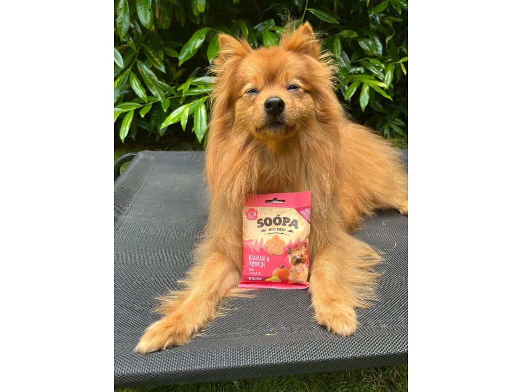 Veganské mini kousky s melounem, jablkem a kokosovým olejem jsou 100% přírodní pamlsky, které představují skvělou volbu i pro pejsky s citlivým zažíváním. Soopa Mini kousky jsou 2x menší než klasické Soopa Healthy Bites. Jejich drobné rozměry z nich dělají ideální pamlsky obzvláště pro malé pejsky. Díky praktickému balení, které se pohodlně vejde do kapsy, jsou ideální i na cesty a vy tak můžete vašeho psího parťáka odměňovat kdykoliv a kdekoliv. Soopa neobsahují obiloviny, umělá barviva a dochucovadla, jsou nízkotučné, hypoalergenní a vhodné i pro psy s nízkoproteinovou dietou. vhodné i pro ta nejmenší plemena bez obilovin, dochucovadel a umělých barviv vyrobeny v Irsku obsahují pouze 100% přírodní suroviny s kokosovým olejem Banány jsou bohatým zdrojem vitamínů, jako je vitamin B6 a vitamin C, které posilují imunitní systém psa. Obsahují také vlákninu, která podporuje optimální trávení a pravidelné vyprazdňování. Díky vysokému obsahu draslíku přispívají banány k udržení správné funkce svalů a nervového systému. Dýně je bohatá na vitaminy A, C a E, které posilují imunitní systém psa a podporují zdravou kůži a srst. Obsahuje velké množství vlákniny a má přirozené protizánětlivé vlastnosti. Kokosový olej je superpotravina bohatá na tzv. MCT tuky, které mimo jiné podporují správnou funkci mozku. Jde o snadno vstřebatelný zdroj energie, vhodný i pro psy s nadváhou. Kromě toho pozitivně ovlivňuje zdraví srsti, kůže a drápků. Pamlsky Soopa jsou vyráběny v Irsku, podle předpisů Human Grade, což znamená, že celý proces zpracování produktu a jeho skladování probíhá za stejných podmínek jako výroba a skladování potravin určených pro lidskou spotřebu. Složení: cizrnová moučka, rostlinný glycerin (ne palmového původu), tapiokový škrob, bramborová moučka (z celých brambor), celulózová vláknina, banán 3,8 % (organický, prášek), kvasnicové produkty, organický kokosový olej 2,38 %, řepkový olej, dýňová moučka 0,95 %, jablečná melasa Analytické hodnoty ve 100 g výrobku: hrubé bílkoviny 6,91 %, hrubá vláknina 1,8 %, hrubé oleje a tuky 5,61 %, hrubé popeloviny 1,86 %, vlhkost 11,4 % Doporučené dávkování: malí psi (do 10 kg) 10 kousků za den, střední psi (10-25 kg) 20 kousků za den, velcí psi (nad 25 kg) 30 kousků za den Množství podávaného pamlsku vždy přizpůsobte hmotnosti, aktivitě a celkové kondici psa. Zajistěte dostatek pitné vody.Doplňkové parametry